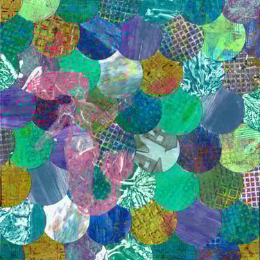 The artwork feels like a conversation between two worlds: the carved certainty of block printing and the fluid unpredictability of gelli textures. Bold, intentional lines rise from the surface like the bones of a story, while translucent layers of color drift across them—swirls, smudges, and ghostly impressions that seem to breathe on their own.
