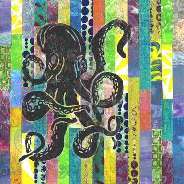 It’s as if the print was built in geological strata: the blockprint provides the bedrock—solid, carved, and confident—while the gelli layers settle over it like shifting tides, carrying hints of pigment, pattern, and chance. The result is a piece that feels both ancient and experimental, like a relic unearthed from a future civilization that loved ink as much as intuition.